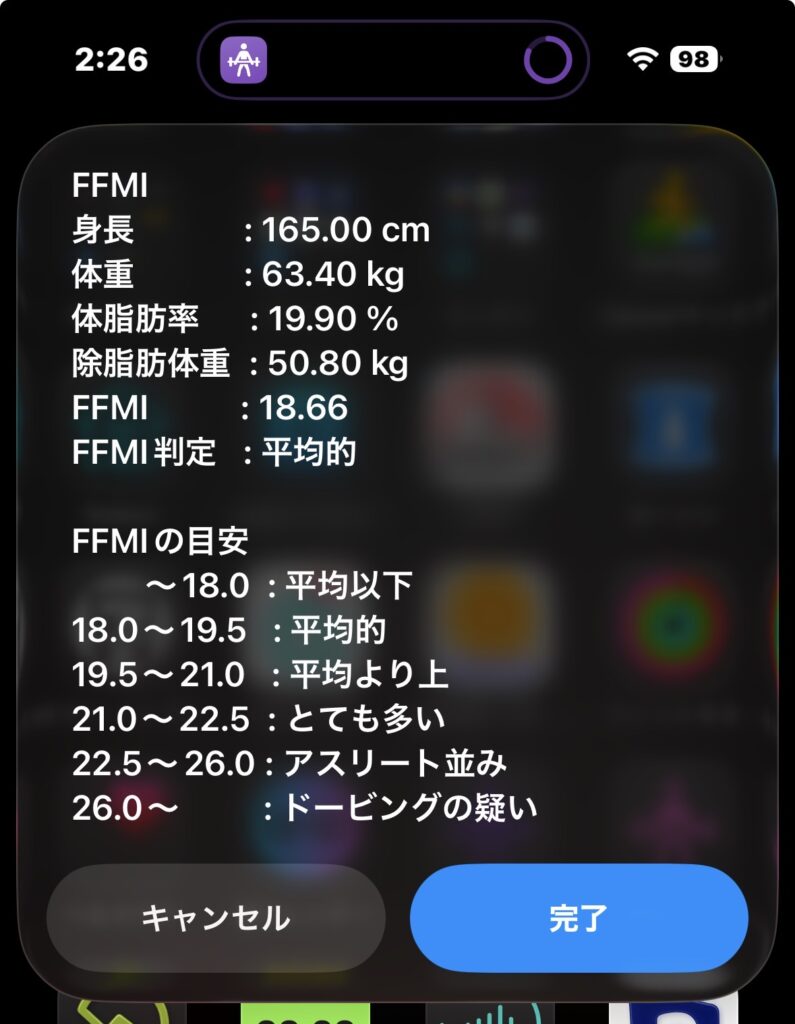 FFMI(Fat-Free Mass Index)は、除脂肪量指数を意味し、筋肉の発達度を評価するための指標。