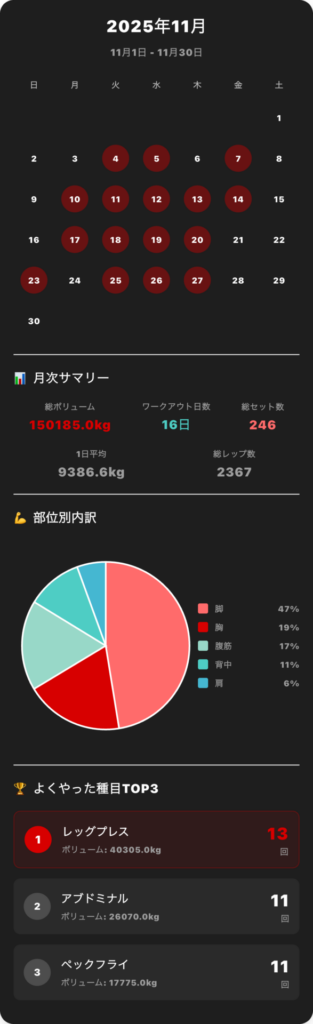 - 圧倒的な脚トレの比率: 全体の約半分が脚のトレーニングです。「レッグプレス」が最多種目(13回)となっており、下半身の筋肥大・代謝アップに大きく貢献した1ヶ月でした。