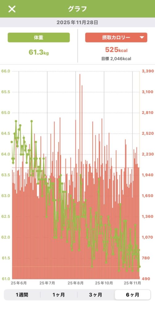 - 6ヶ月の推移: 6月の約64.5kgから現在の61.3kg付近まで、非常にきれいな下降トレンドを描いています。