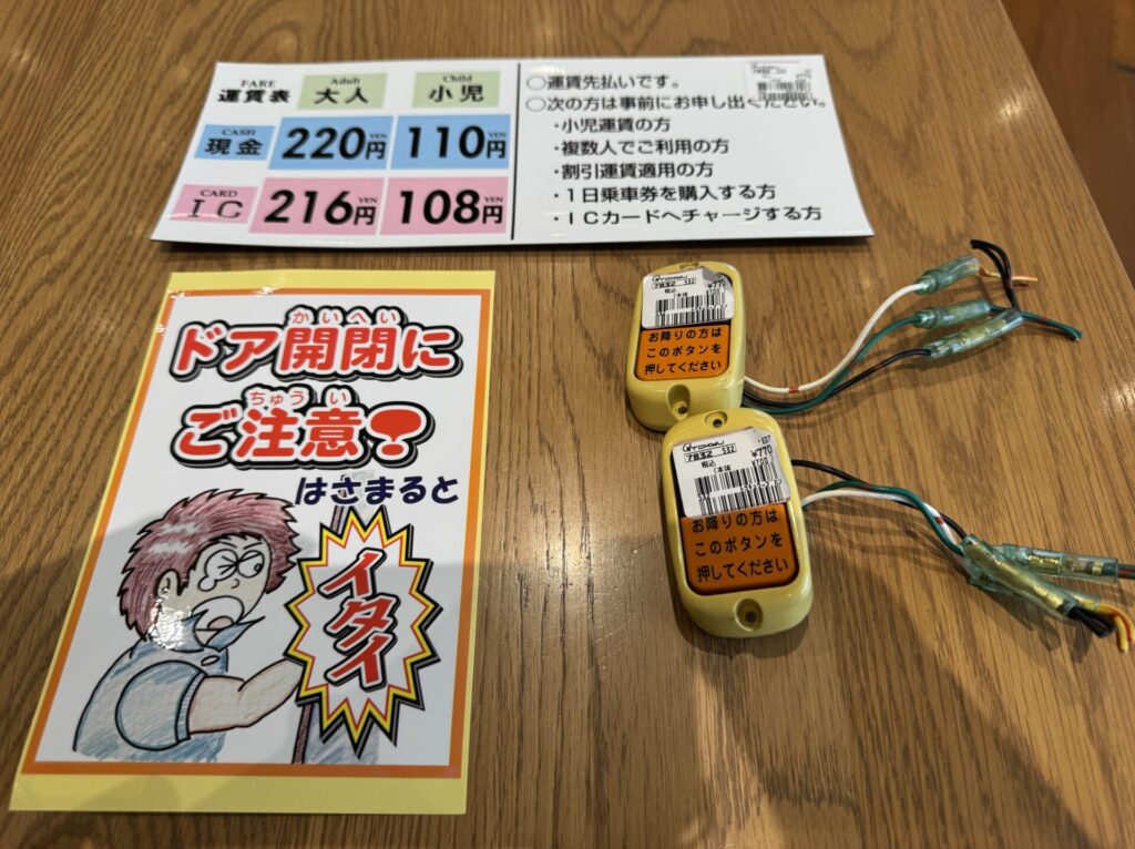 また、降車ボタンを押すとチャイムと「次止まります」の音声を流します。