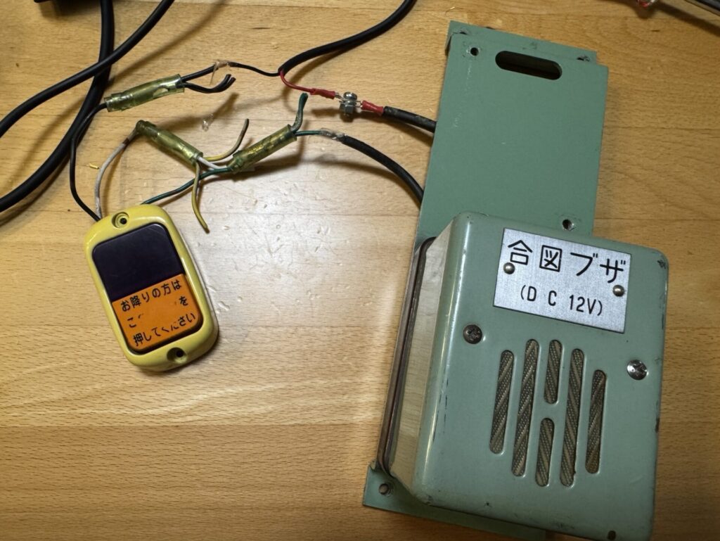 同様にボタンの動作確認。DC12Vのブザーがあるので接続。電源+とブザー+、ブザーGNDとボタン緑線、ボタン黒線と電源-をそれぞれ接続。