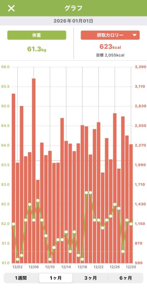 12月を通じた日次推移。忘年会等のイベントによる一時的な変動はあるものの、月間平均ではコントロールの範囲内。摂取カロリーと体重の相関に大きな乖離は見られない。