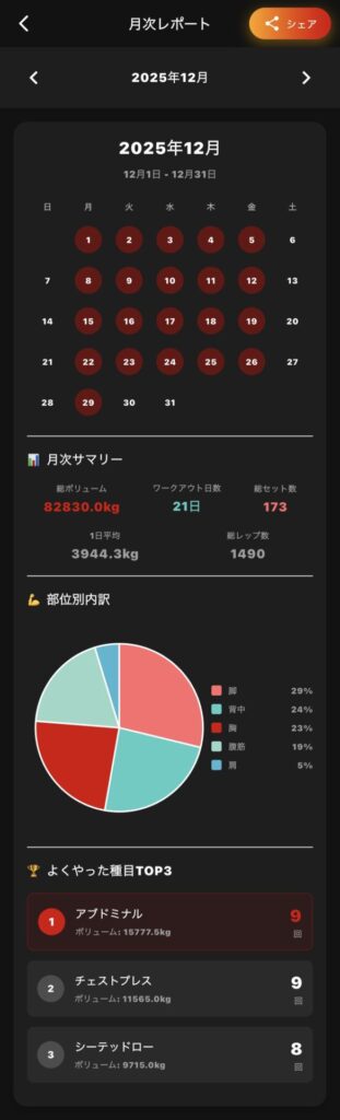 - 脚(29%)、背中(24%)、胸(23%)がメイン。
